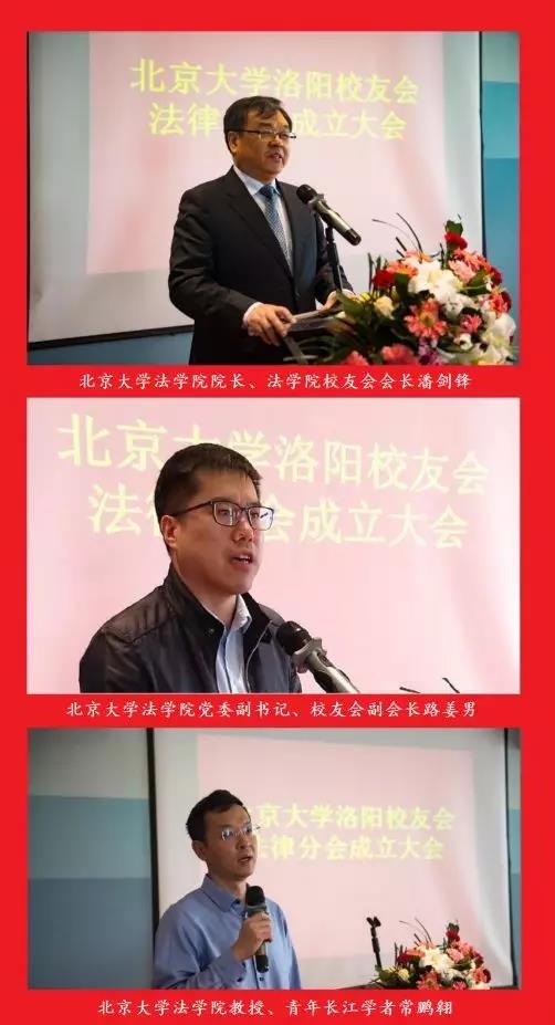 北京大学洛阳校友会常务理事赵大伟介绍法律分会筹备情况,会长郭引强宣读北京大学洛阳校友会拟提议法律分会导机构人选,与会校友代表举手表决,选举赵大伟任法律分会会长,袁志生任法律分会副会长兼秘书长,杨迅波任法律分会副会长。会上,北京大学法学院党委副书记、校友会副会长路姜男致辞,从凝聚校友、服务校友、助力校友三个方面介绍法学院校友工作情况及取得的成绩。北京大学法学院院长、法学院校友会会长潘剑锋发表讲话,从北京大学师生规模及构成、教学、科研、际交流、硬件设施等方面介绍了法学院近年来的主要工作和取得的喜人成绩,与会校友备受鼓舞,十分振奋。潘剑锋院长还向洛阳校友会颁发了赠送母校300株牡丹花的捐赠证书。