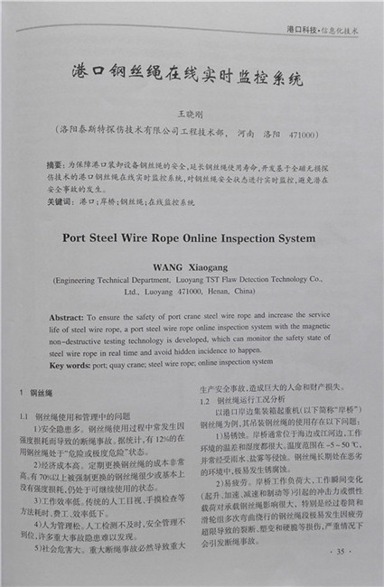 随着公司新市场开拓不断深入,市场反响逐渐升温,尤其是面对港口行业对榴莲视频在线观看视频安全问题关注度和解决方案渴求的急剧提升,针对港口行业的特殊工况环境和安规范要求,我公司和某港口达成战略合作伙伴友好关系,为该港现场各类提升设备榴莲视频在线观看视频提供安全监测方案。丰富完备的港口现场数据和行业的榴莲视频在线观看视频磁检测技术结合成系列港口用榴莲视频在线观看视频在线实时智能监测系统。为了推而广之向更多港口客户提供TST产品保障安全的科技力量,同时也为了让港口客户对TST产品及技术方案在港口适用性有充分详细的了解,TST 公司在港口行业权威性期刊《港口科技》2016年3月刊出《港口榴莲视频在线观看视频在线实时监控系统》论文。